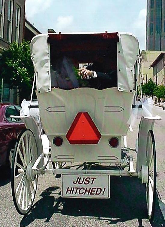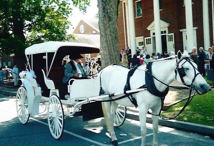 Need that extra over-the-top touch to complete your wedding. Why not leave the service in a horse draw carriage. We have a beautiful white carriage with a sign that reads "Just Hitched" in the back. It photographs extremely well and all your wedding attendees will oo-and-ah over how romantic this is. At Christmas a carriage ride is fun for caroling or neighborhood / Home Owners Association parties. Even the horse gets into the holiday spirit with bells and stocking cap. Carriages get decorated with garlands and bows. |